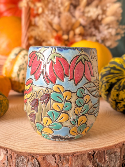 Adorned with whimsical designs of beetles, moths, dragonflies, mushrooms, acorns, berries, and wildflowers, every mug wraps its artwork around the form, creating a scene that feels alive with nature’s spirit.